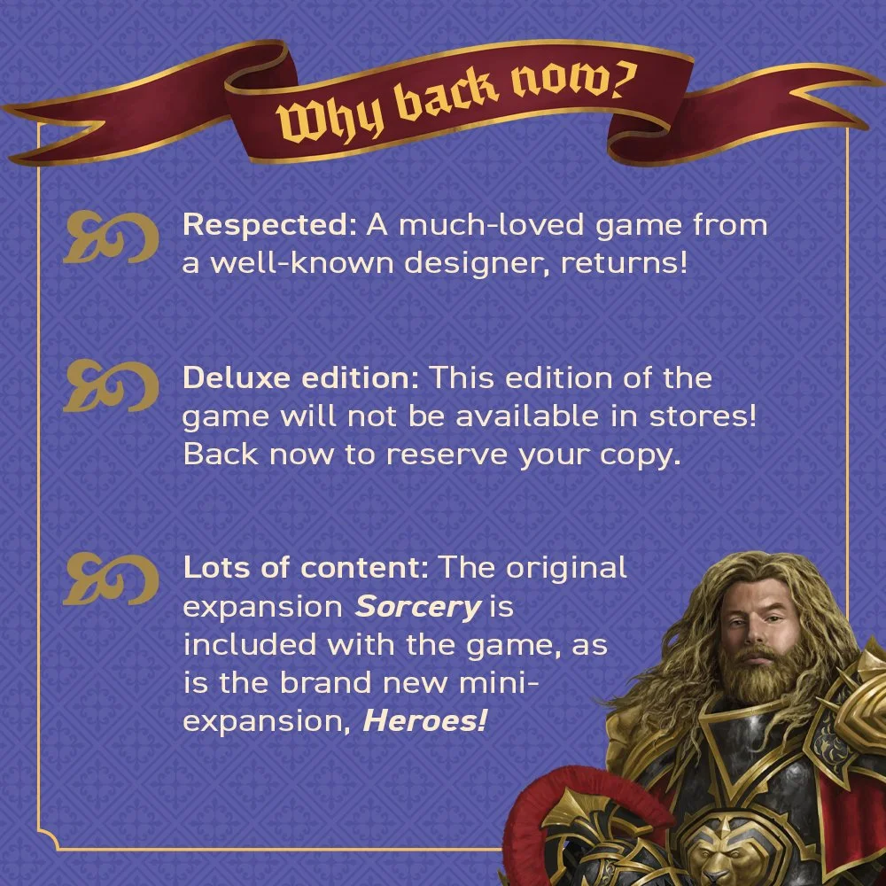Designed by Marc André (Splendor) and illustrated by Bastien Jez, Grail Games is pleased to announce the return of a classic! This Royal Edition will include the complete Sorcery expansion, as well as the all-new Heroes expansion, and the possibility to play the game with 5 players!