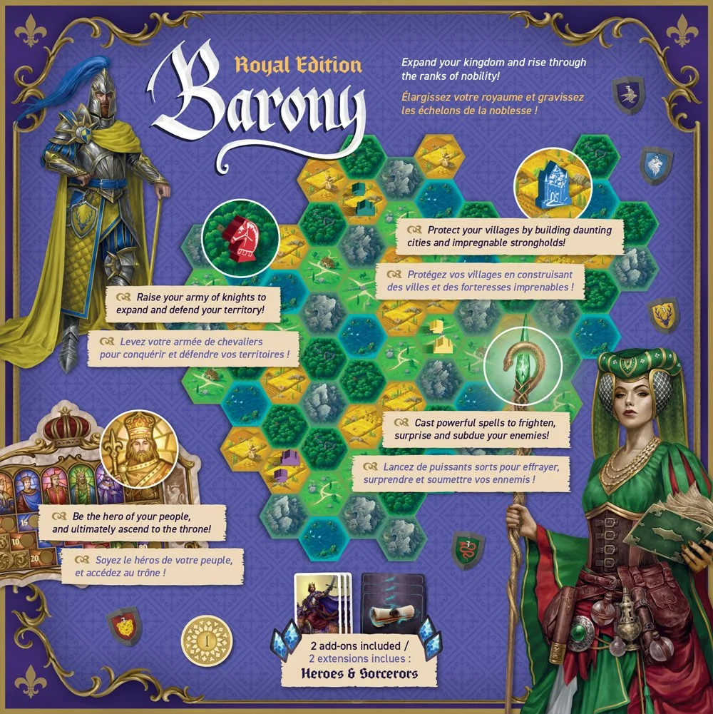 Barony was originally released in 2015. The Royal Edition includes all new art and components! It also includes the Barony: Sorcery expansion (released in 2016) and the all-new Heroes expansion that gives players asymmetric abilities.